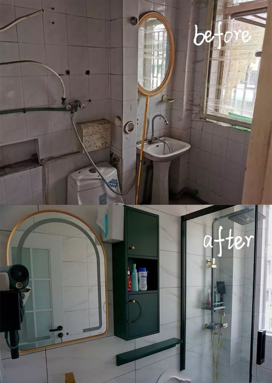 卫生间是变化最大的地方,改造前一看就是有些年头的设计了,各种管子都裸露在外。改造后墨绿色的柜子时尚简约,大块的长条瓷砖比小块方瓷砖更适合小空间的卫生间,可以让空间具有较强的延伸感。淋浴区是玻璃推拉门的干湿分离设计。整体家装风格都非常干净整洁,白色是基色,利用金属色和比较鲜明的颜色做辅色,层次感丰富,还很干净清爽!改造前后的风格, 完全看不出是一套房啊!